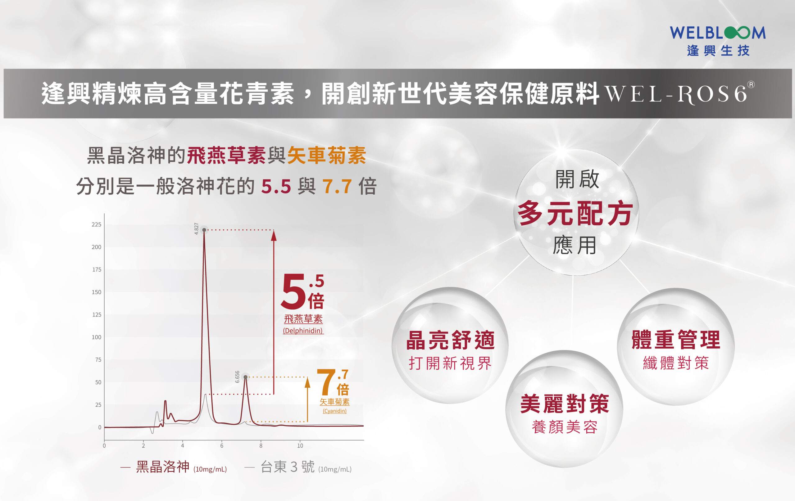 現代人對健康與美麗的雙重追求日益提升,美容保健食品市場正迎來前所未有的爆發性成長。在這波浪潮中,逢興生技以卓越的研發實力推出革命性原料——Wel-ROS6®,以榮獲台灣、日本、中國三國專利認證方式,進一步的鞏固其原料技術的領先地位。台東農改廠耗時九年的潛心研發育成新品種——黑晶洛神,相比於市售常見的台東3號洛神花,這種洛神花花青素的含量更是翻倍的增加,在經過逢興生技的獨家萃取技術後,飛燕草素與矢車菊素等花青素含量上分別多了5.5倍和7.7倍,締造了Wel-ROS6在花青素方面王中之王的亮眼佳績。