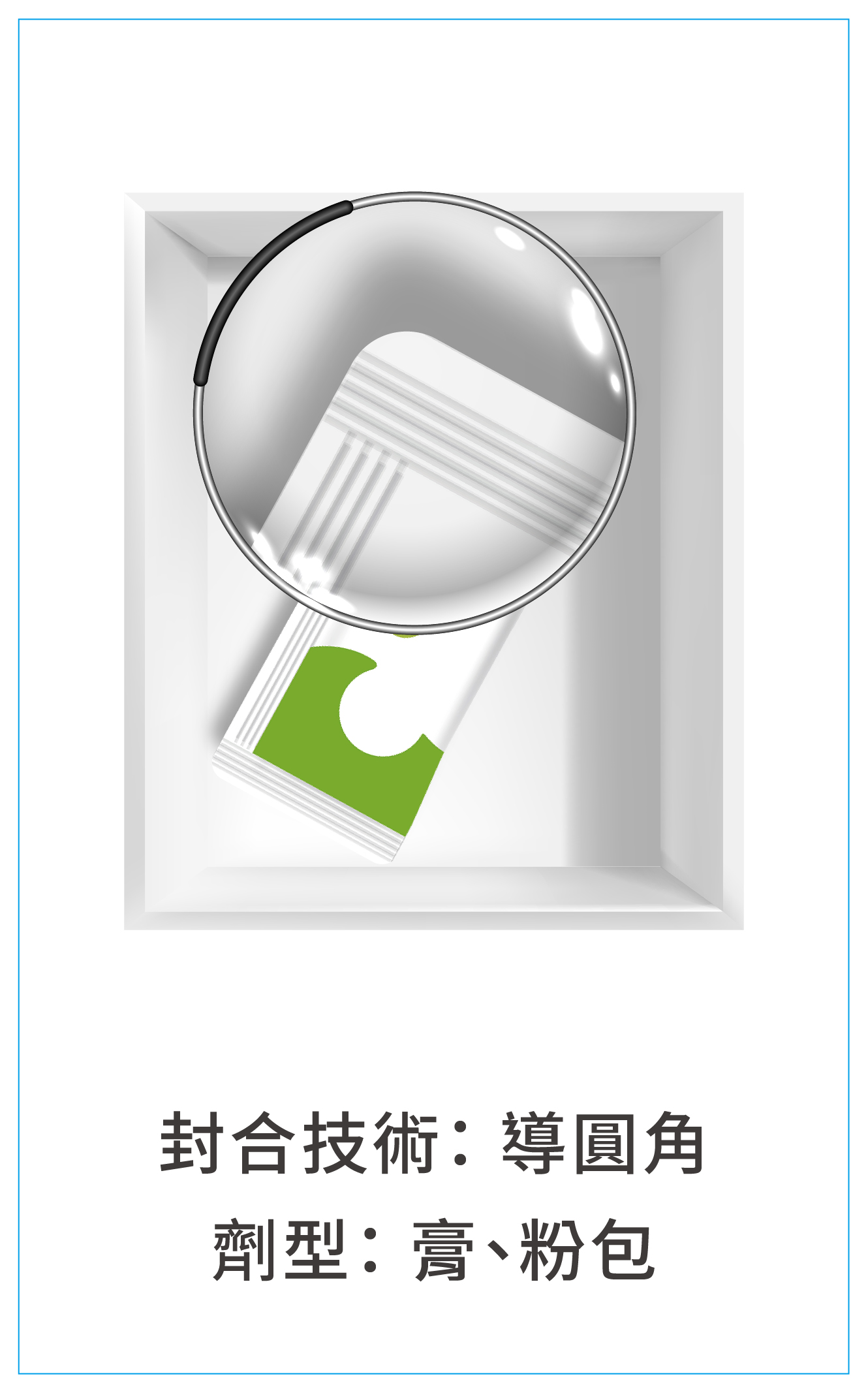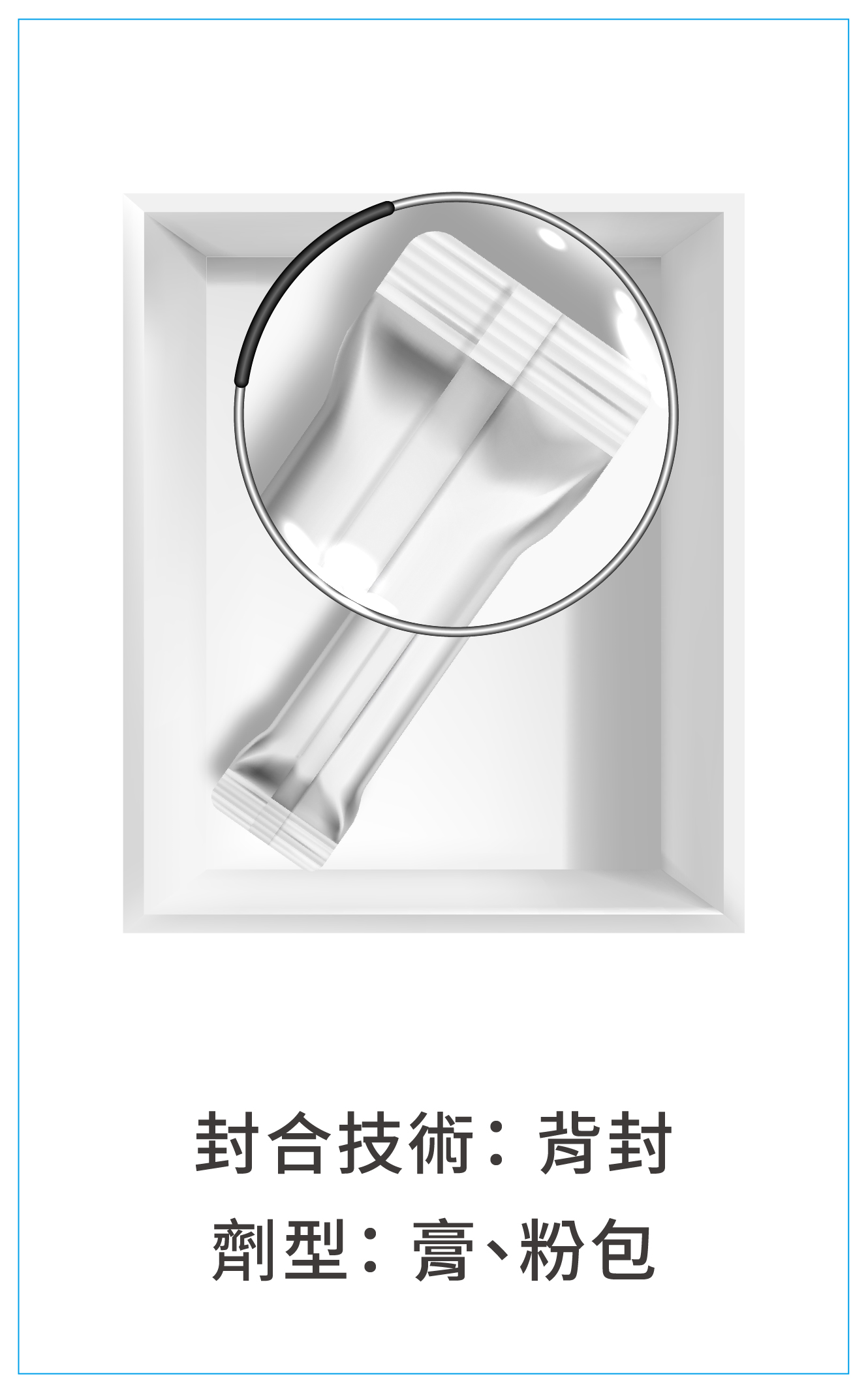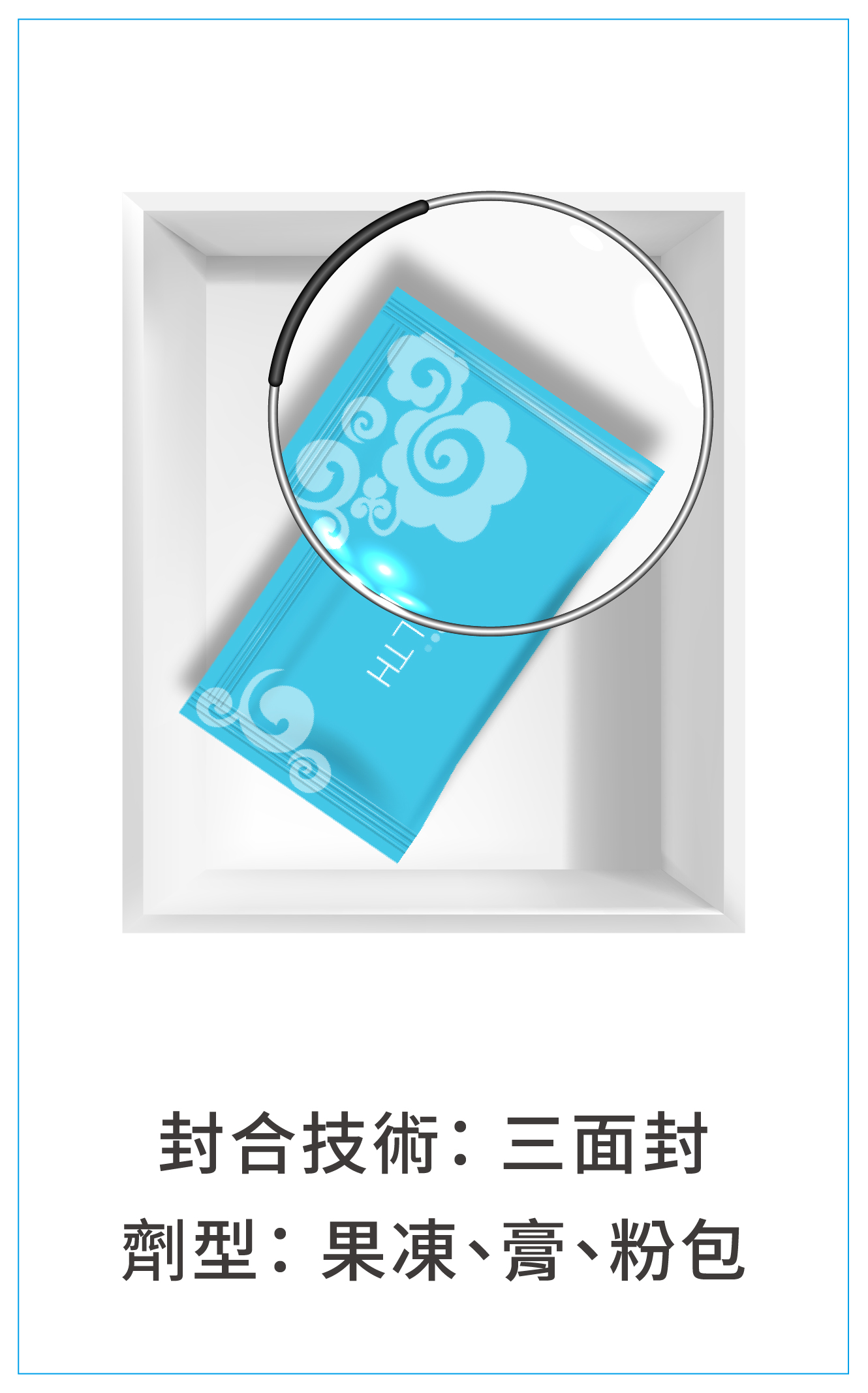 逢興生技為保健食品一站式代工廠,除了六大劑型、各式客製化鋁袋以及材質可選擇外,也提供不同的鋁袋封合技術—三面封、導圓角、背封,讓您可以針對目標客群,選用不同的封合技術,增加客製化鋁袋的變化。