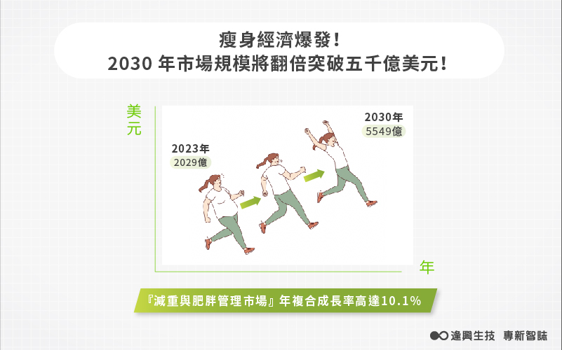 飲控配合運動是追求健康體態的不二法則,坊間出現減醣飲食、生酮飲食,或是近年來風靡的間歇性斷食,都試圖幫助人們更有效率地甩掉多餘體重,「減重與肥胖管理」市場也迎來前所未有的增長!根據市場數據,全球減重和肥胖管理市場在2023年估計已達到2,829億美元,並預計在2030年將增長至5,549億美元,年複合成長率高達10.1%[1]。